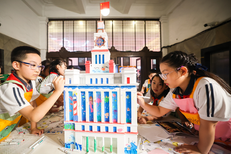 在三楼展厅入口处,一个色彩斑斓的海关大楼模型吸引了不少参观者驻足。这个原本素白的模型,在开幕式当天被报童小学的几位学生画上了自己心目中的图案——有的画了藏宝箱,有的画了海龟,还有的在钟楼上画出自己的想象。