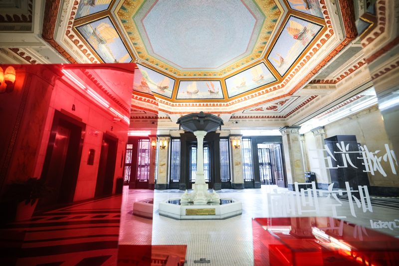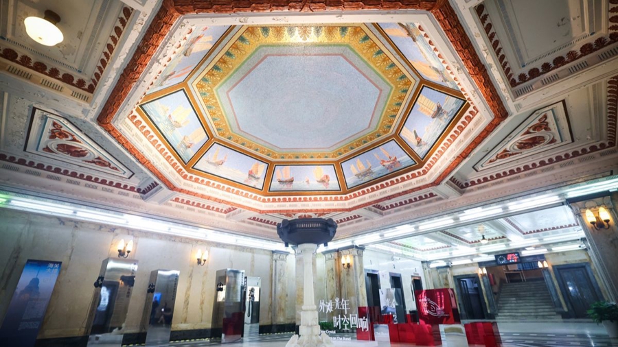海关大楼一楼,白玉装置与八角形藻井设计的穹顶壁画相呼应。(海沙尔摄)
